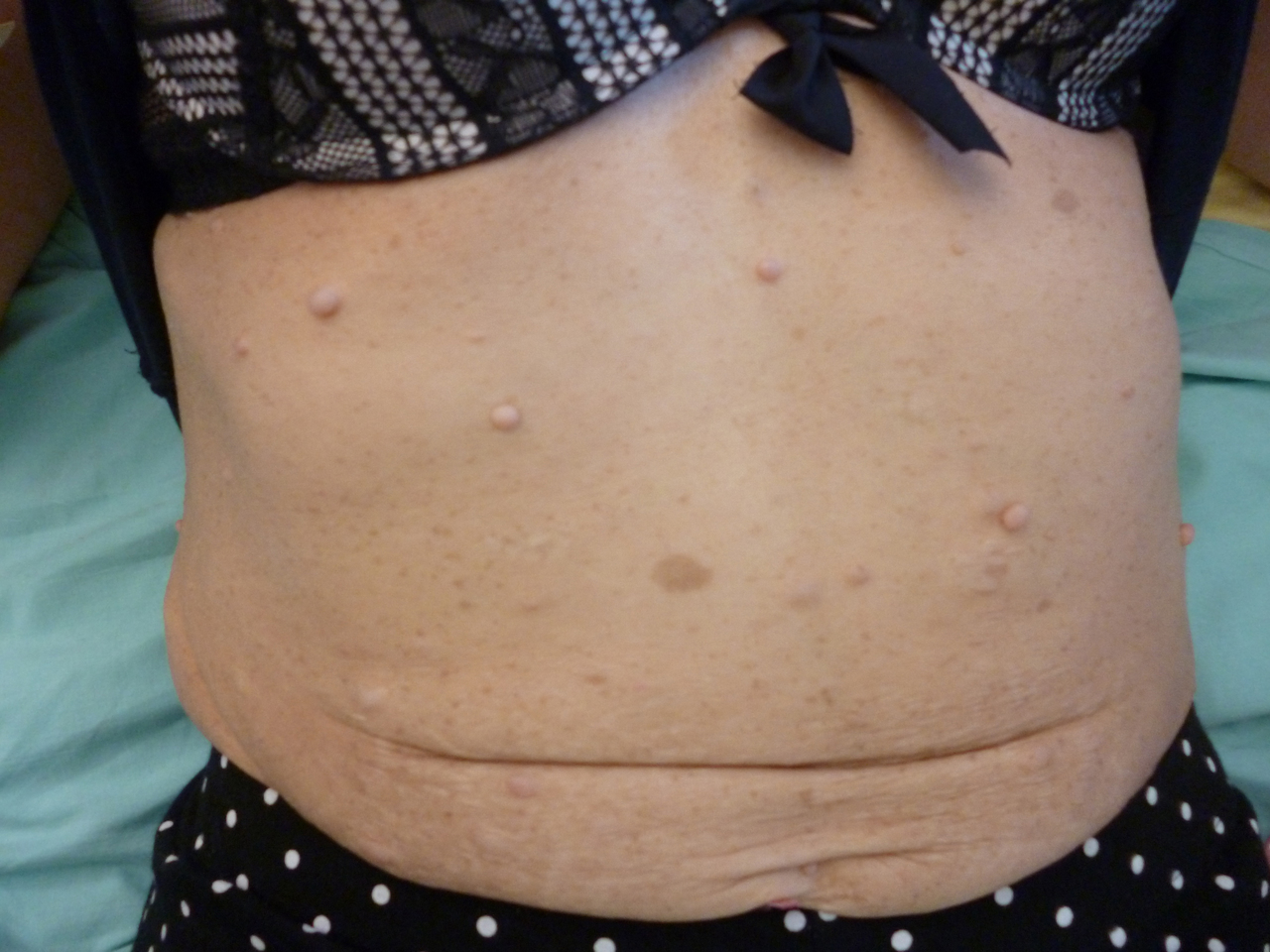 Il s'agit d'une neurofibromatose de Recklinghausen. Le terme de phacomatose regroupe un ensemble d'affections, souvent héréditaires, caractérisées par des anomalies diverses et multiples portant sur les feuillets embryonnaires primitifs, principalement d'origine ectodermique. La neurofibromatose de type 1 (NF1) est une phacomatose fréquente (1/3 500 naissances) de transmission autosomique dominante. Les formes sporadiques (mutations de novo) représentent environ la moitié des cas. Il existe une grande variabilité phénotypique, y compris au sein d'une même famille. Le diagnostic est avant tout clinique, parfois frappant comme ici devant la présence de multiples neurofibromes cutanés. Le diagnostic, souvent plus difficile, est en général porté en présence d'au moins 2 des 7 critères suivants : - Au moins 6 taches café au lait, de plus de 5 mm dans leur plus grand diamètre chez des individus prépubères et de plus de 15 mm chez des individus pubères. - Au moins 2 neurofibromes de n'importe quel type ou un neurofibrome plexiforme. - Des lentigines axillaires ou inguinales. - Un gliome optique. - Deux nodules de Lisch ou plus (hamartomes iriens). - Une lésion osseuse caractéristique comme une dysplasie sphénoïde, un amincissement de la corticale des os longs avec ou sans pseudarthrose. - Un parent du premier degré atteint de NF1 suivant les critères précédents. Compte tenu de la diversité des atteintes, une prise en charge multidisciplinaire au sein de centres spécialisés, en relation étroite avec le médecin traitant et/ou le pédiatre est souhaitable. L'évolution est imprévisible tout au long de la vie et nécessite un suivi clinique régulier afin de détecter précocement les complications, différentes selon les tranches d'âge. Pour en savoir plus :- Valeyrie-Allanore L, Wolkenstein P. Phacomatoses. Rev Prat 2008;58(7):717-24. - Azib S, Valeyrie-Allanore L. Neurofibromatose de type 1. Rev Prat Med Gen 2011;25(870):778-9.