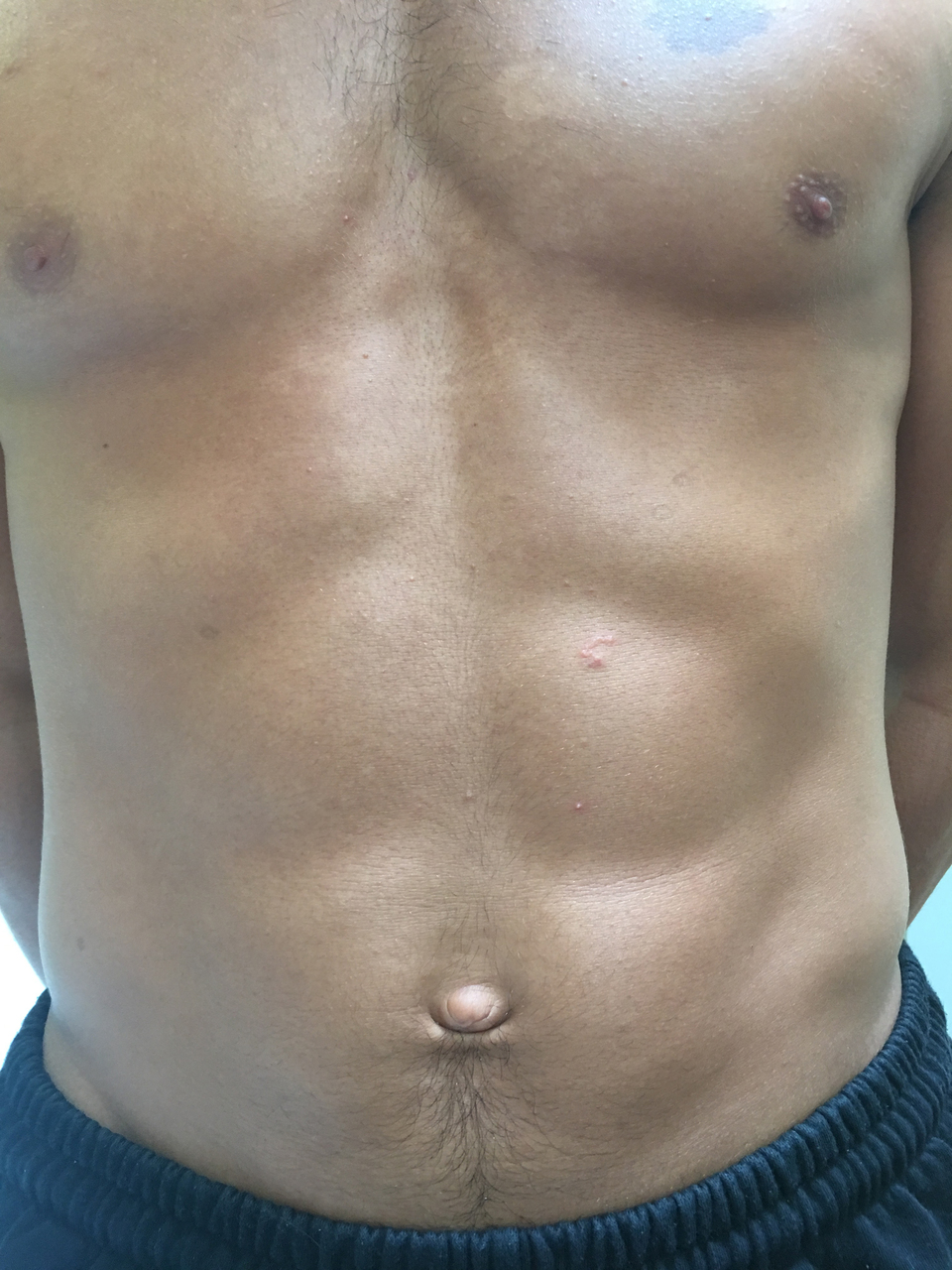 Il s'agit d'une Larva migrans cutanée. LARVA MIGRANS CUTANÉE : UNE ÉRUPTION GLISSANTE, Qi Zhang, Ahmed Djeradi, Myriam Chemouny, Nicolas Javaud*. * Urgences, AP-HP, Hôpital Louis Mourier, Université Paris Diderot, Colombes, France. Ce jeune homme de 19 ans consultait aux urgences 7 jours après son retour de Guadeloupe. Deux jours avant, il avait ressenti un prurit localisé à l'abdomen. L'examen physique mettait en évidence une éruption cutanée (v. figures) serpigineuse abdominale de 3 cm de longueur. À l'interrogatoire, il précisait avoir été en contact direct avec des sols sablonneux. Les examens biologiques étaient normaux, en particulier pas d'hyperéosinophilie et sérologie toxocarose négative en ELISA. Le diagnostic de larva migrans cutanée était retenu. Un traitement par ivermectine en dose unique était alors prescrit. L'évolution clinique était favorable avec la disparition de la lésion cutanée et du prurit. La larva migrans cutanée est le plus souvent causée par la migration, dans l'épiderme, de larves d'ankylostome (Ancylostoma caninum et braziliense) transmises par contact avec des selles de chiens ou chats infectés.(1) Les patients infectés diagnostiqués dans les pays développés sont majoritairement des voyageurs de retour de zones tropicales.(2) Dans une étude prospective observationnelle de voyageurs français revenant de destinations tropicales, une larva migrans cutanée était diagnostiquée chez 8 (1,3 %) des 622 patients hospitalisés dans un service de maladie infectieuse.(3) Le diagnostic est clinique supporté par une histoire de voyage et la possibilité d'une exposition.(2) L'éruption cutanée apparaît principalement sur les pieds (39 % des cas), les fesses (18 % des cas) et l'abdomen (16 % des cas).(4) L'éosinophilie, présente ou non, n‘est pas spécifique. L'A. caninum peut être détecté par ELISA sans qu'il y ait de données sur la sensibilité et la spécificité du test.(2)Le traitement de choix est l'ivermectine. Une dose unique (200 µg/kg de poids) permet un taux de guérison compris entre 77 % et 100 % selon les études. Dans l'hypothèse d'un échec du traitement initial, une deuxième dose permet la guérison.(2, 5) Références1. Ma DL, Vano-Galvan S. Images in clinical medicine. Creeping eruption--cutaneous larva migrans. N Engl J Med 2016;374:e16.2 ; Heukelbach J, Feldmeier H. Epidemiological and clinical characteristics of hookworm-related cutaneous larva migrans. Lancet Infect Dis 2008;8:302-9.3. Ansart S, Perez L, Vergely O, Danis M, Bricaire F, Caumes E ; Illnesses in travelers returning from the tropics: a prospective study of 622 patients. J Travel Med 2005;12:312-8.4 ; Blackwell V, Vega-Lopez F. Cutaneous larva migrans: clinical features and management of 44 cases presenting in the returning traveller ; Br J Dermatol 2001;145:434-7.5 ; Van den Enden E, Stevens A, Van Gompel A. Treatment of cutaneous larva migrans. N Engl J Med 1998;339:1246-7.