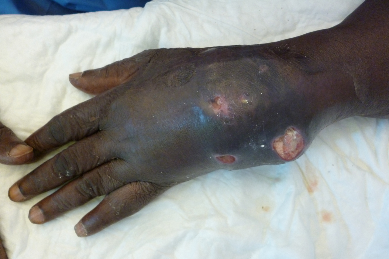 Quel est votre diagnostic ? Mycétome Tuberculose Sarcoïdose Pian Goutte Il s'agit d'une goutte. Pour en savoir plus :- Guggenbuhl P, et al. Dossier Arthropathies microcristallines. Rev Prat 2015;65(5):665-82.- Chalès G. Colchicine dans la goutte : usage et mésusage. Rev Prat 2017;67(9):935-40.- Ea HK. Goutte et hyperuricémie : les nouveautés. Rev Prat Med Gen 2012;26(881):363-5. OK Valider mes réponses