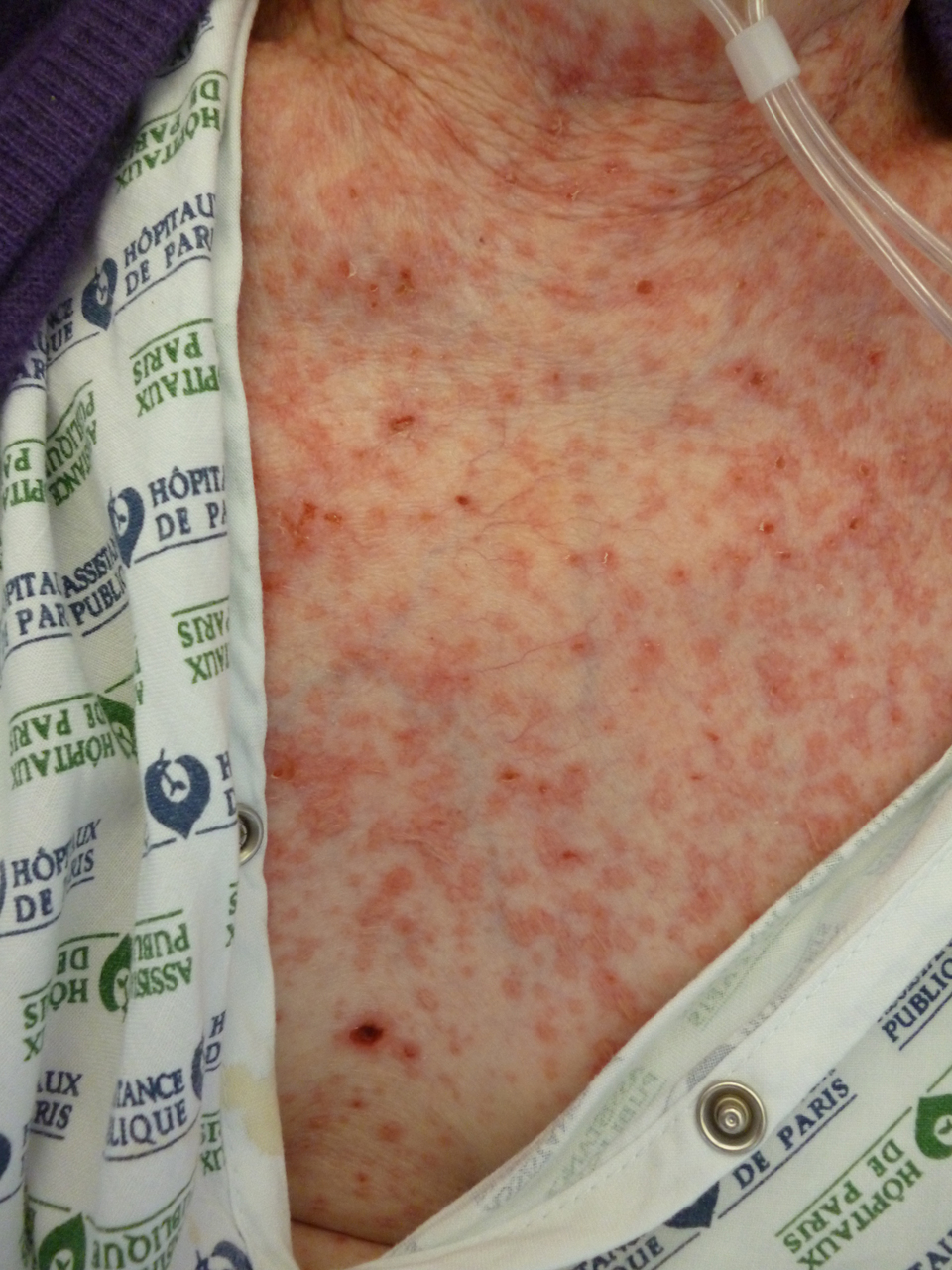Il s'agit d'un zona non systématisé, avec preuve virologique, chez une femme de 85 ans ayant un antécédent de lymphome.