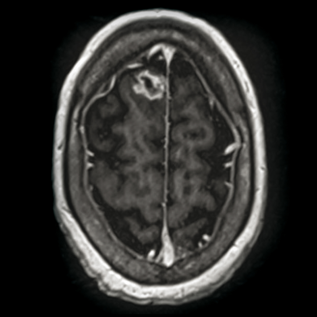 Quel est votre diagnostic ? Abcès à pyogènes Tuberculome Toxoplasmose Lymphome Aspergillome Il s'agit d'un aspergillome.Pour en savoir plus :- Bourée P, Bisaro F. Aspergillose. Rev Prat 2008;58(9):933-8. OK Valider mes réponses