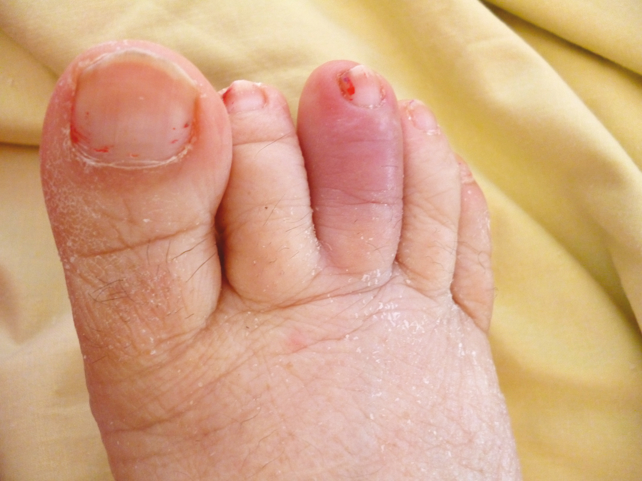 Le rhumatisme psoriasique appartient au groupe des spondyloarthrites. Son diagnostic est souvent difficile en raison de son grand polymorphisme clinique ; l'atteinte articulaire peut survenir en l'absence de lésion dermatologique de psoriasis. La dactylite est un signe très évocateur de rhumatisme psoriasique. Elle peut survenir au niveau des doigts ou des orteils (tuméfaction inflammatoire douloureuse "en saucisse").