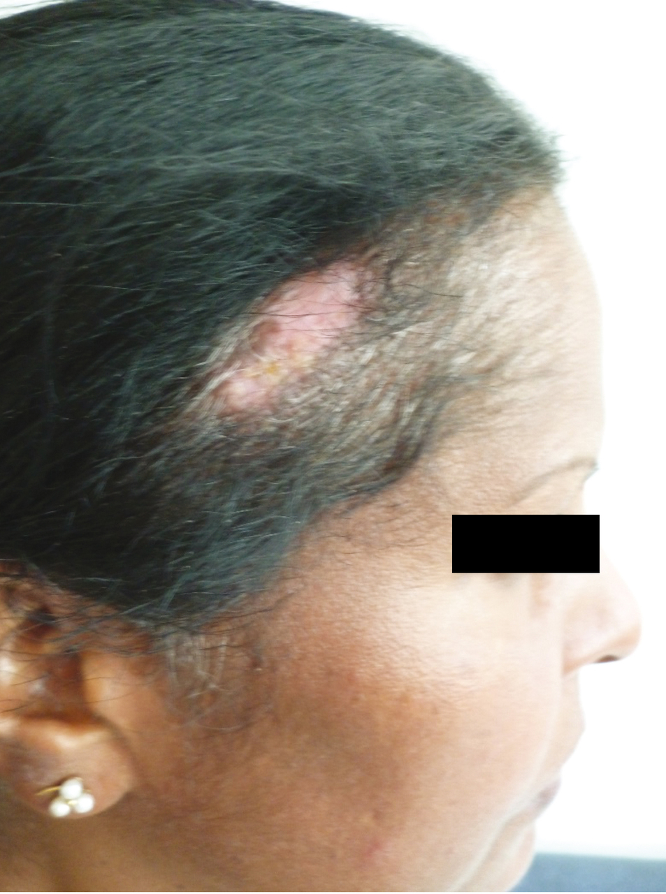 Une femme de 36 ans se plaint d'arthralgies et a une lésion du cuir chevelu.