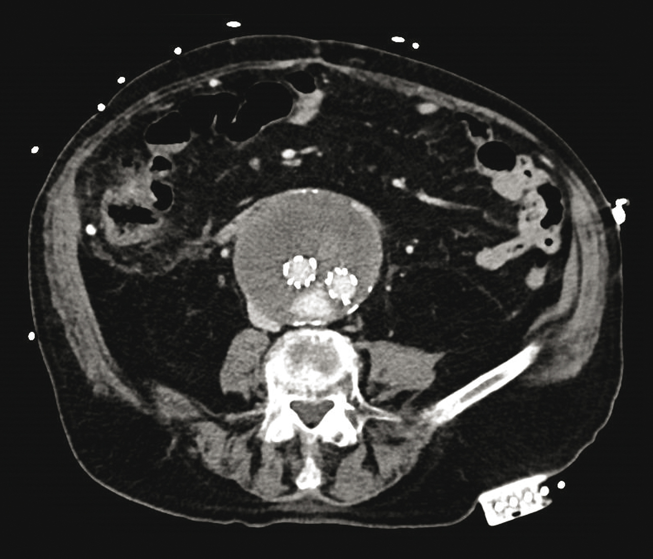 Le traitement des anévrismes de l’aorte abdominale a été révolutionné par l’avènement des traitements endovasculaires, offrant des résultats à long terme comparables à ceux de la chirurgie conventionnelle. Cette endoprothèse, positionnée sous contrôle radiologique à l’aide d’un cathéter introduit à partir des artères fémorales, est positionnée au niveau de l’anévrisme. Une fois déployée, l’anévrisme est alors exclu de la circulation ; le sang s’écoulant, en aval de l’anévrisme, au travers de l’endoprothèse. Une surveillance est néanmoins nécessaire compte tenu du risque de survenue d’une fuite de sang entre la paroi aortique et l’endoprothèse (par une perte de l’intimité du contact) ou à partir d’une branche collatérale de l’aorte avec perfusion persistante de l’anévrisme. La surveillance après la mise en place d’une endoprothèse comprend, au moins un premier examen scanographique (angio-TDM dans la plupart des cas) postopératoire dans le mois qui suit, sauf contre-indication puis une surveillance régulière par échodoppler moyen et long terme.