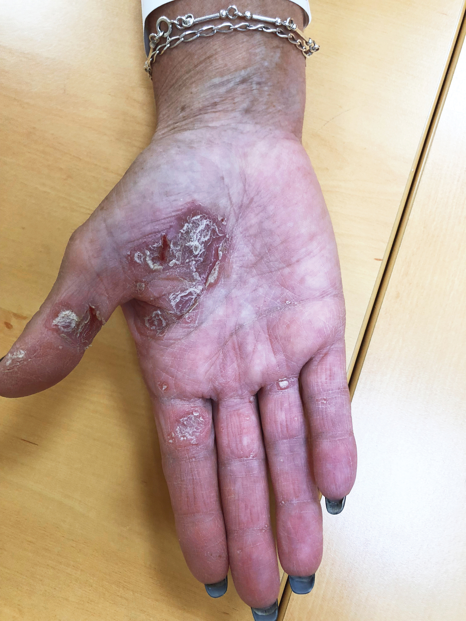 Une femme de 64 ans consulte pour des lésions de la face palmaire de la main droite apparues depuis quelques semaines.