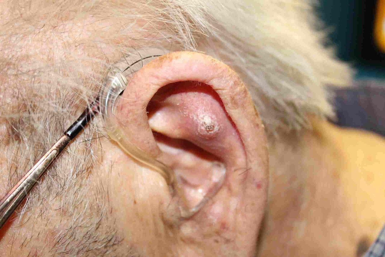 Un patient, ancien viticulteur de 78 ans, a des lésions au niveau de son oreille gauche apparue il y a plus de 6 mois, et qui augmentent très progressivement de volume.