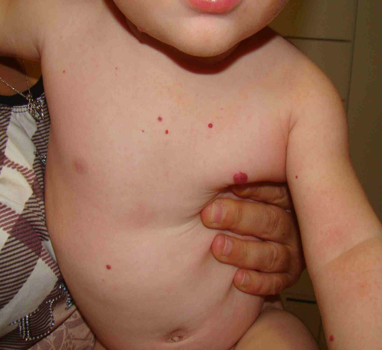 Un enfant de 2 mois a des lésions érythémateuses sur le corps, dont le nombre augmente au fil du temps.