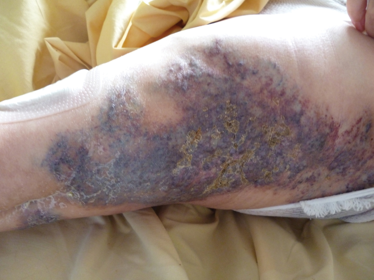 Un homme de 67 ans est hospitalisé pour un érysipèle du membre inférieur gauche, qui évolue favorablement sous antibiotiques. Cependant une lésion ancienne de la cuisse persiste.