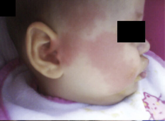 Cet enfant de 5 mois a un flush des régions temporale, pré-tragienne, auriculaire, jugale, malaire et mandibulaire.