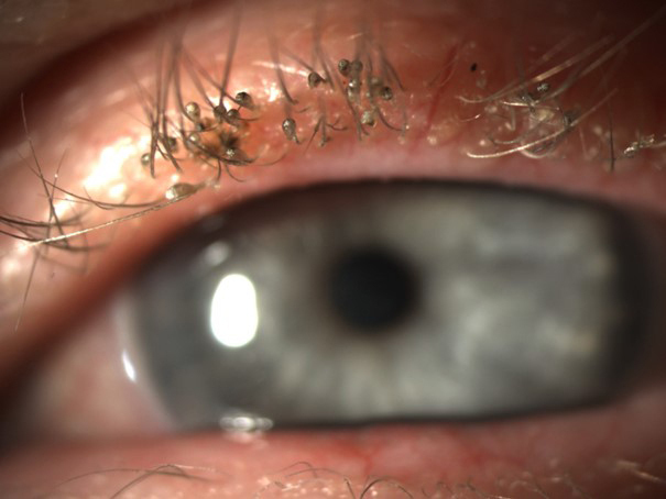 C’est une phtiriase ciliaire. On distingue clairement les lentes accrochées aux cils. Le phtirius inguinalis colonise de préférence les poils pubiens et les cils, plutôt que les cheveux, en raison du diamètre différent des phanères, selon leur topographie. Le traitement consiste à peler chaque lente à la pince, à épiler et à appliquer une pommade grasse (vaseline ou vitamine A) sur la zone atteinte, pour asphyxier les parasites, qui respirent par leur carapace. Il faut bien sûr associer les mesures de déparasitage des autres topographies corporelles, de l’entourage, du matériel contact.
