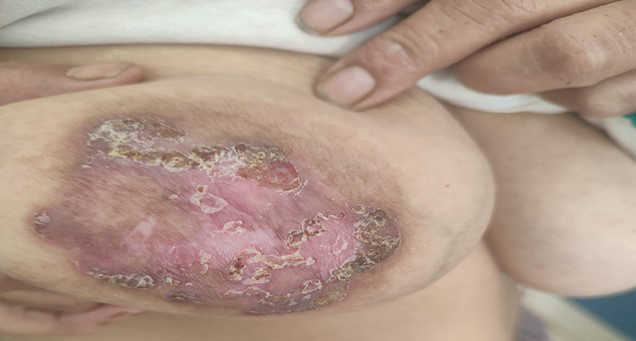 Une patiente âgée de 52 ans consulte pour une plaque eczématiforme érythémato-squameuse intéressant la plaque aréolo-mamelonnaire (PAM), unilatérale, débordante sur la peau, bien limitée, indolore, non prurigineuse, légèrement infiltrée apparue il y a 3 mois et persistant après l’application de stéroïdes topiques.