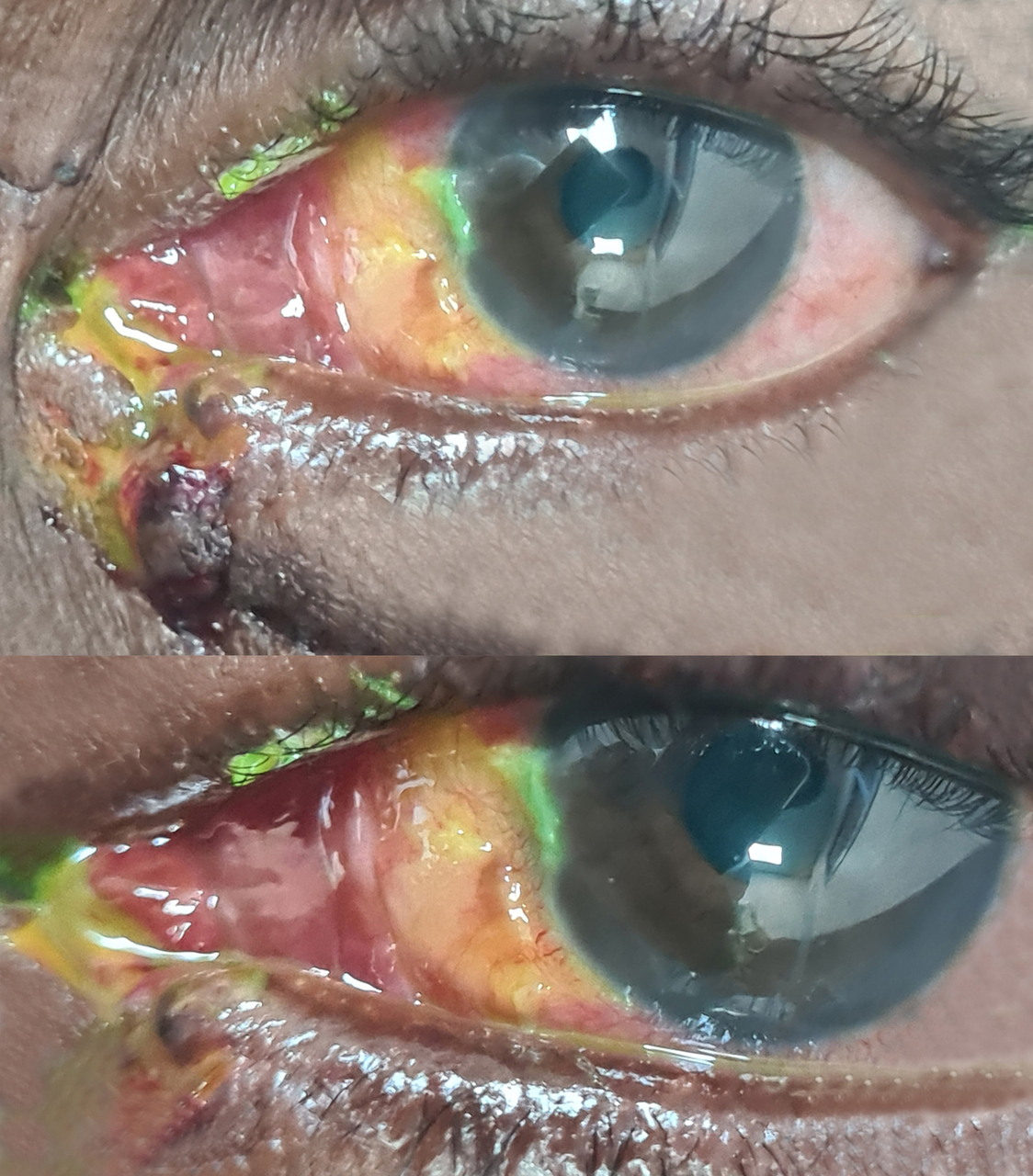 Une exploration au bloc opératoire est requise. Il faut explorer chirurgicalement à la recherche d’une plaie des voies lacrymales car on observe une plaie canthale interne inférieure, en regard du canalicule lacrymal inférieur voire du canal d’union. Il faut aussi éliminer ou traiter une plaie pénétrante avec ou sans CE intraoculaire.