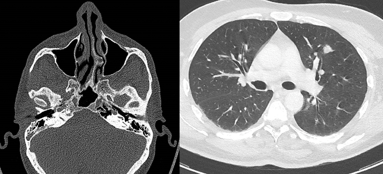 Le scanner montre un comblement des cellules mastoïdiennes et un nodule pulmonaire. La CRP est à 125 mg/L. Il a une protéinurie et une hématurie à la bandelette urinaire.