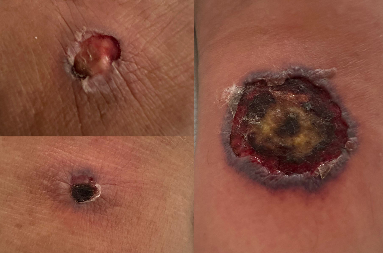 Vous recevez une patiente de 56 ans avec comme antécédents : un diabète de type 2 sous metformine mal équilibré, une sclérose en plaques en rémission sous ocrélizumab depuis 20 ans et une hypothyroïdie sous Levothyrox 100 µg. Vous observez des lésions ulcéronécrotiques qu’elle dit avoir depuis 5 jours.