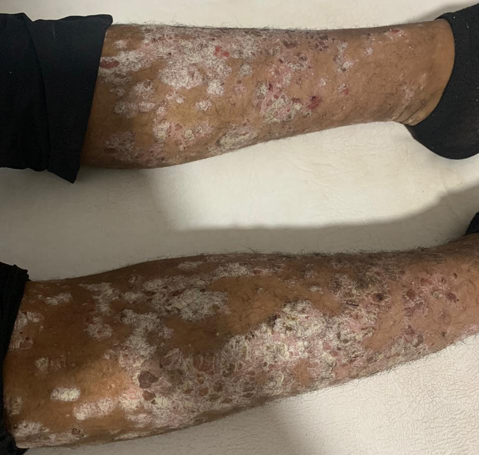Le psoriasis est une affection cutanée inflammatoire chronique fréquente, prédisposant à certaines comorbidités, comme le syndrome métabolique. Les formes sévères sont les érythrodermies psoriasiques, les psoriasis pustuleux et les rhumatismes psoriasiques. Cliniquement, la lésion élémentaire est une maculopapule érythémateuse et squameuse (squames blanchâtres adhérentes), arrondie et polycyclique à limites nettes. Sur peau foncée (comme dans ce cas-ci), les plaques sont moins érythémateuses, parfois hypochromiques ou hyperchromiques, plus épaisses et souvent plus diffuses. Le diagnostic est clinique, mais, en cas de doute, l’analyse anatomopathologique sur biopsie cutanée permet de le confirmer. Le traitement des formes légères ou limitées repose sur les dermocorticoïdes associés aux analogues de la vitamine D et aux kératolytiques. Dans les formes modérées à sévères, un traitement systémique (méthotrexate, ciclosporine, biothérapie…) et/ou une photothérapie sont indiqués. Ces traitements suspensifs nécessitent un suivi régulier en dermatologie.