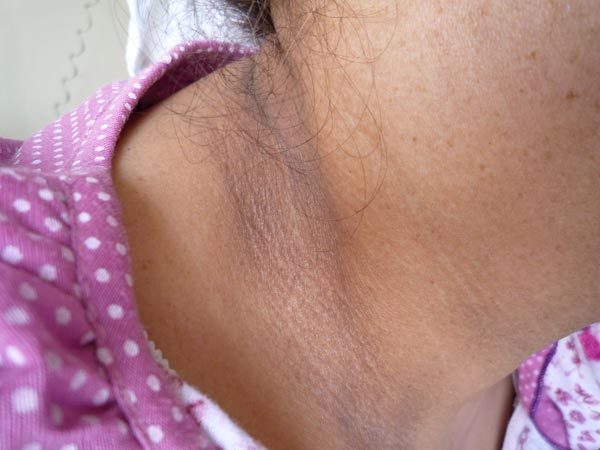 L’acanthosis nigricans est une anomalie cutanée rare caractérisée par une hyperpigmentation en plaques mal limitées, avec un aspect velouté et épaissi de la peau (du grec akantha qui signifie « épine, écaille » et du latin nigricare qui signifie « être noirâtre »). Ces taches se trouvent volontiers dans les zones de flexion, en particulier les plis axillaires et inguinaux et peuvent aussi siéger au niveau de la nuque et des faces latérales du cou donnant à la peau un aspect sale. L’acanthosis nigricans touche souvent des patients obèses et insulinorésistants. Dans tous les cas, un cancer sous-jacent (voies aérodigestives supérieures, lymphome) doit être évoqué.