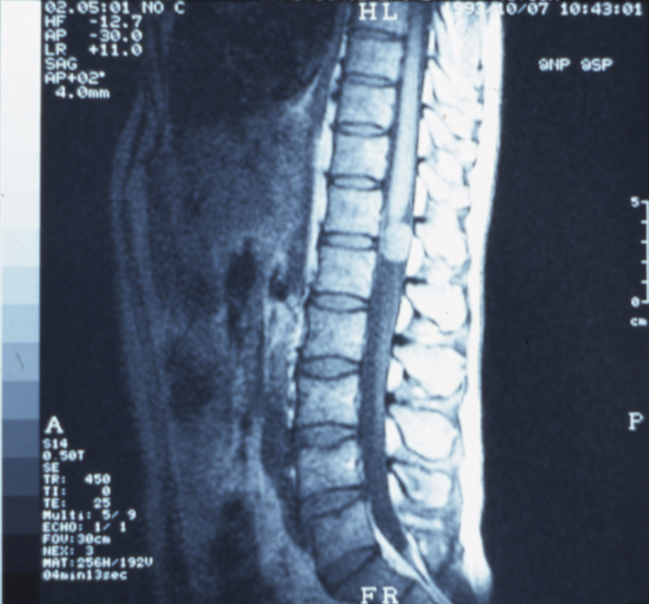 Le neurinome ou schwannome survient le plus souvent chez l’homme, vers la quarantaine. Classiquement, le symptôme inaugural est constitué de douleurs rachidiennes très intenses, volontiers nocturnes, résistant aux antalgiques. Le schwannome se développe dans l’espace périmédullaire à partir d’une racine. Il peut être malaisé à distinguer avec certitude d’un méningiome en IRM. Rarement son développement est à la fois intra- et extracanalaire, donnant un aspect de tumeur « en sablier ». Le foramen intervertébral apparaît alors élargi sur les radiographies standard. À noter, enfin, l’association possible à une neurofibromatose,qui ne doit pas être méconnue.