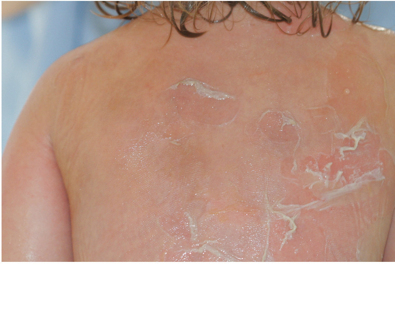 C’est une affection toxinique due à la diffusion d’exfoliatines A et B sécrétées par certaines souches de Staphylococcus aureus. L’épidermolyse staphylococcique succède à une infection focale bénigne, cutanée (impétigo, surinfection de varicelle, omphalite) ou muqueuse (infection ORL, conjonctivale ou vulvaire). Contrairement au syndrome de Lyell, le décollement reste superficiel (l’exfoliatine clive les couches supérieures de l’épiderme) et les muqueuses sont épargnées. Il y a parfois de la fièvre, mais l’état général est conservé.