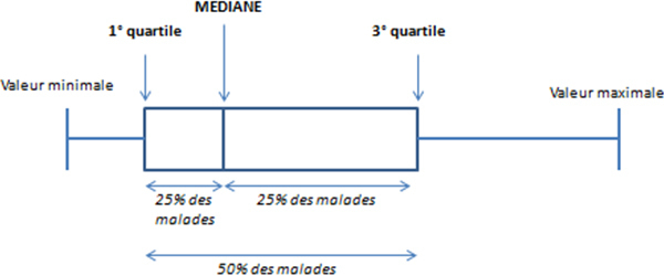 En cas de distribution normale, la courbe de distribution est une courbe de Gauss, et la médiane = moyenne. – Écart type : notion plus difficile à aborder, il s’agit d’une variable de dispersion permettant de décrire comment les valeurs se répartissent autour de la médiane et de la moyenne. . Calculée : racine carrée de la variance. . En cas de répartition gaussienne : – 68 % des observations se trouvent entre médiane-écart type et médiane + écart type ; – 95 % des observations se trouvent entre médiane-2 écarts types et médiane + 2 écarts types. – Quantile : un pourcentage des valeurs observées est inférieur au quantile. Par exemple : . Centile : 1 % des valeurs est inférieur au quantile. . 37e percentile : 37 % des valeurs sont inférieures. . La médiane = 50e percentile = 5e décile… . Ces quantiles permettent d’établir des espaces interquartiles : espace entre le premier quartile (25 % des malades) et le troisième quartile (75 % des malades). Le deuxième quartile correspond à la médiane. – 25 % des malades ont une valeur observée inférieure à la borne inférieure de l’intervalle ; – 50 % ont une valeur observée entre les deux bornes de l’intervalle ; – 25 % ont une valeur observée supérieure à la borne supérieure de l’intervalle.