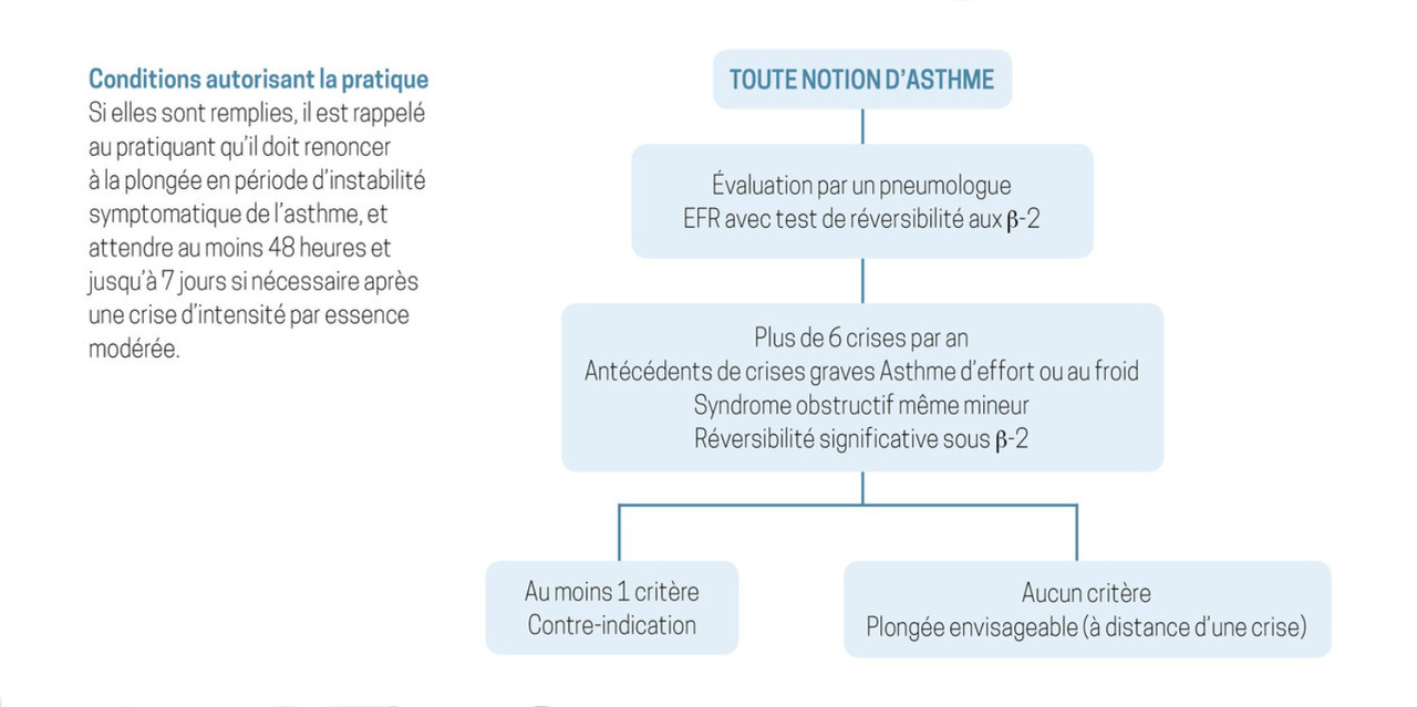 Pour la plongée sous-marine avec bouteille, des recommandations spécifiques ont été élaborées par la Fédération française d’études et de sports sous-marins (FFESSM) :