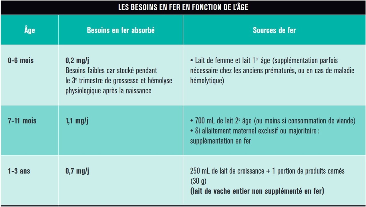 Après l’âge de 1 an, l’intérêt majeur des laits de croissance est leur contenu en fer. En effet, pour atteindre les 0,7 mg/j de fer absorbé recommandés (tableau), l’enfant devrait être en mesure d’ingérer 100-150 g de produits carnés par jour (en 2 portions), ce qui n’est pas réalisable avant 3 ans. Environ 360 mL/j de lait de croissance sont nécessaires pour satisfaire les besoins en fer (ou 250 mL + 1 portion de 30 g de produit carné).