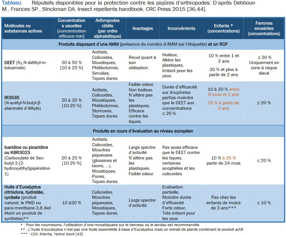 Les recommandations du BEH 2023 sur les répulsifs anti-moustiques sont synthétisées dans le tableau ci-dessous.