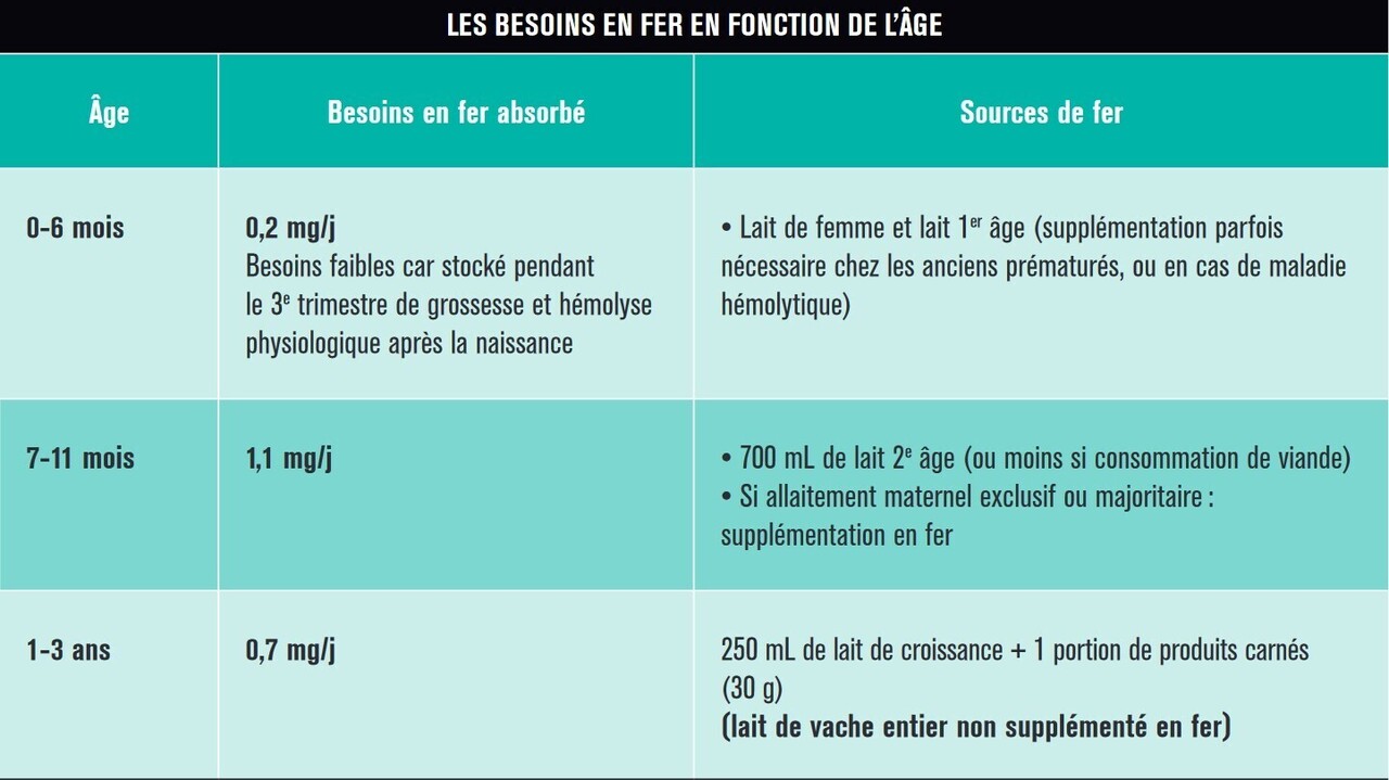 Quels sont les besoins en fer du nourrisson ? Les besoins en fer du nourrisson sont les suivants : D’après : Lemoine A. Diversification de l’alimentation du nourrisson.Rev Prat 2021;71(10);1080-3.