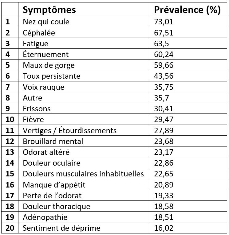 D’après les données recueillies par le ZOE Covid Study au Royaume Uni (réalisé par le King’s College et le National Health Service), les symptômes les plus fréquemment observés lors d’une infection par omicron sont : Voir : Spector T. What are the symptoms of omicron? The Conversation, 11 janvier 2022.