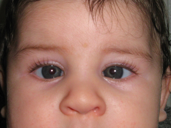 Strabisme convergent ou ésotropie précoce (survenue avant l’âge de 6 mois) de l’œil gauche avec œil droit fixateur. Le reflet lumineux est sur le bord pupillaire, l’angle de la déviation est donc de 16 degrés.