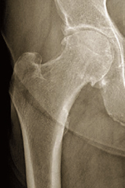 À l’examen, le genou est sec et indolore à la mobilisation. Il n’y a pas de kyste poplité. Cependant, la mobilisation de la hanche montre un syndrome clinostatique franc (impossibilité pour le patient de décoller le talon du plan du lit, jambe tendue, allongé sur le dos) en faveur d’une atteinte de l’articulation coxofémorale. Celle-ci est suspectée devant une limitation douloureuse des amplitudes de la hanche droite, notamment en abduction et rotation interne. Le cliché suivant a été réalisé au décours de la consultation.