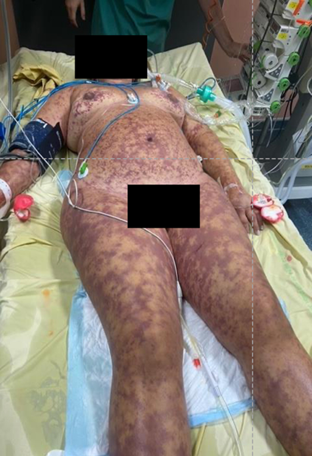 Le purpura fulminans peut faire l’objet d’un dossier aux ECN et doit absolument être connu de l’étudiant. Il est le plus souvent secondaire à une méningococcémie (bactériémie à méningocoque, qui est un diplocoque Gram négatif). L’éventuelle atteinte méningée n’est qu’au second plan. L’antibiothérapie par ceftriaxone doit être immédiate, après prélèvement d’une paire d’hémocultures (sauf en préhospitalier). La ponction lombaire est contre-indiquée ici en présence de stigmates cliniques de CIVD. La biopsie cutanée peut être réalisée après l’antibiothérapie avec examen direct et mise en culture (possibilité également de réaliser une PCR sur cette biopsie). La patiente doit bien sûr être isolée (masque chirurgical, précautions de type « gouttelettes ») en cas de suspicion de méningite à méningocoque.