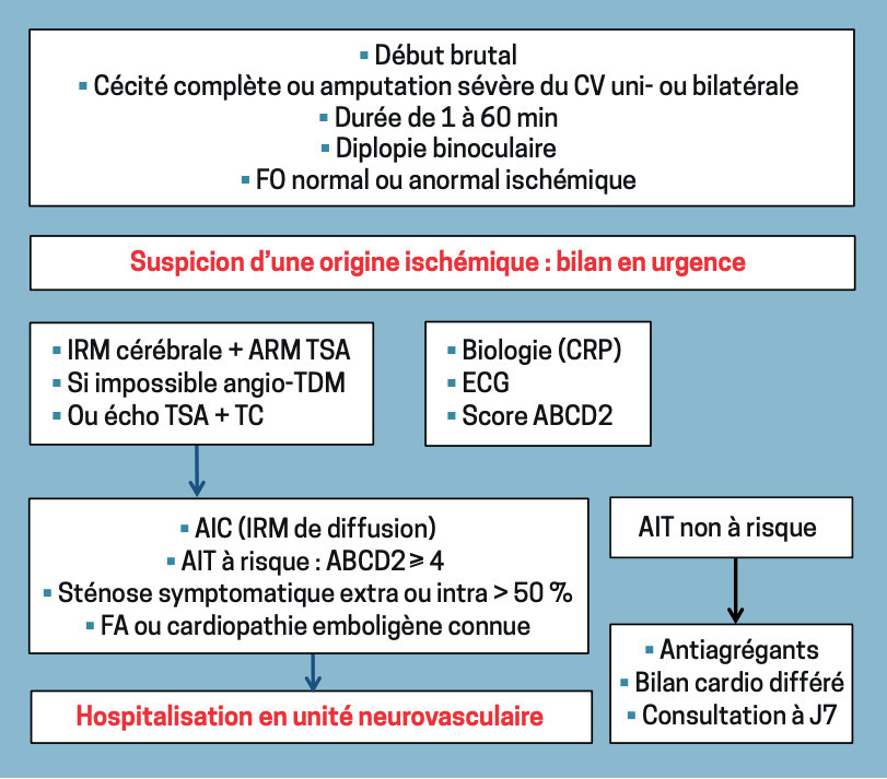 On entend par troubles visuels transitoires (TVT) une cécité monoculaire ou binoculaire transitoire, des troubles du champ visuel (CV) ou une diplopie. Leur origine peut être oculaire, ischémique (AIT rétiniens ou cérébraux) ou non, ou alors neurologique (migraine, épilepsie, œdème papillaire dans un contexte d’hypertension intracrânienne, neuropathie optique). Il faut reconnaître les éléments en faveur d’une cause ischémique, imposant une prise en charge urgente (risque d’accident vasculaire constitué).