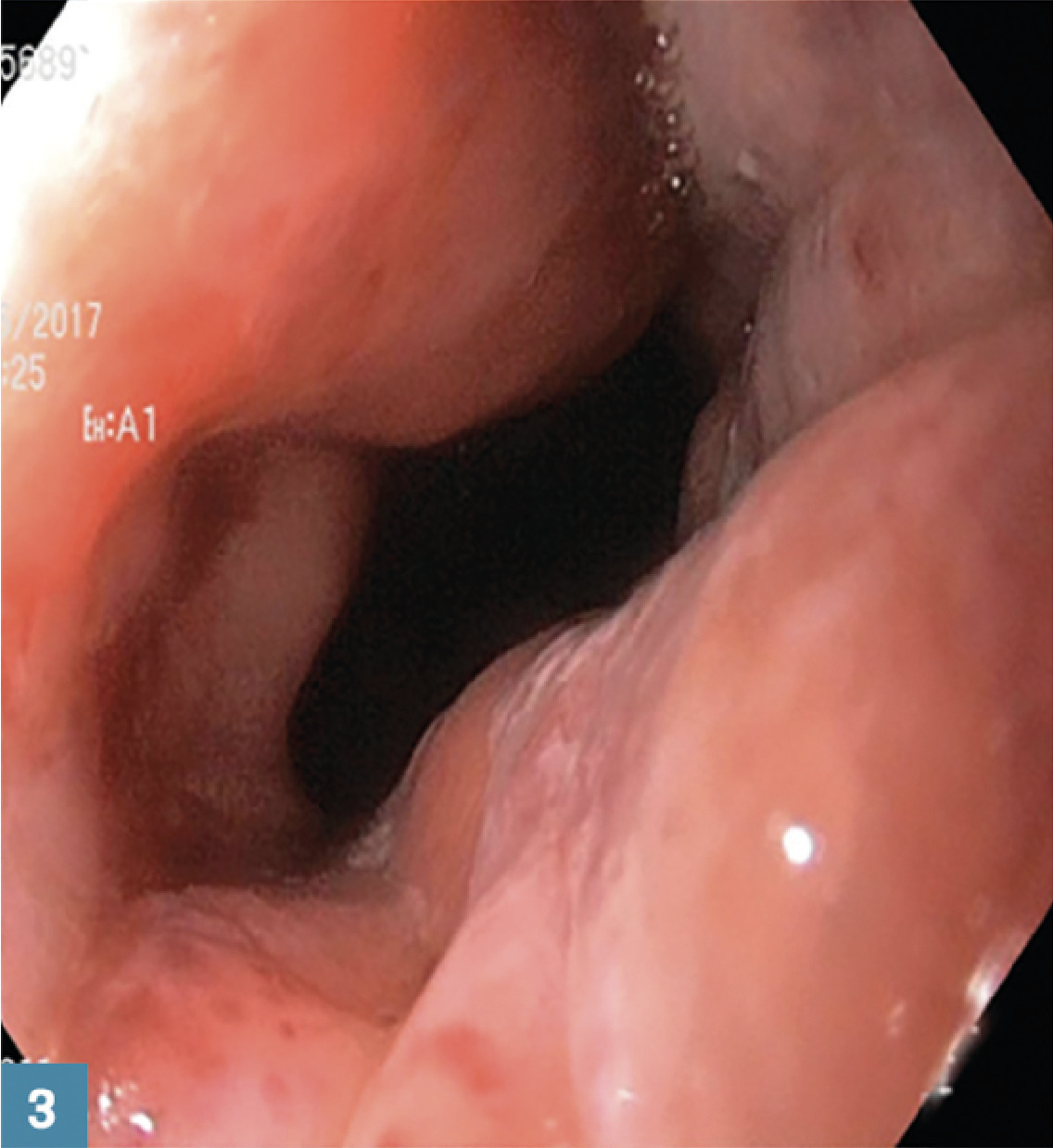 3 Après dilatation pneumatique : aspect béant avec lésions muqueuses superficielles de la jonction œsogastrique.