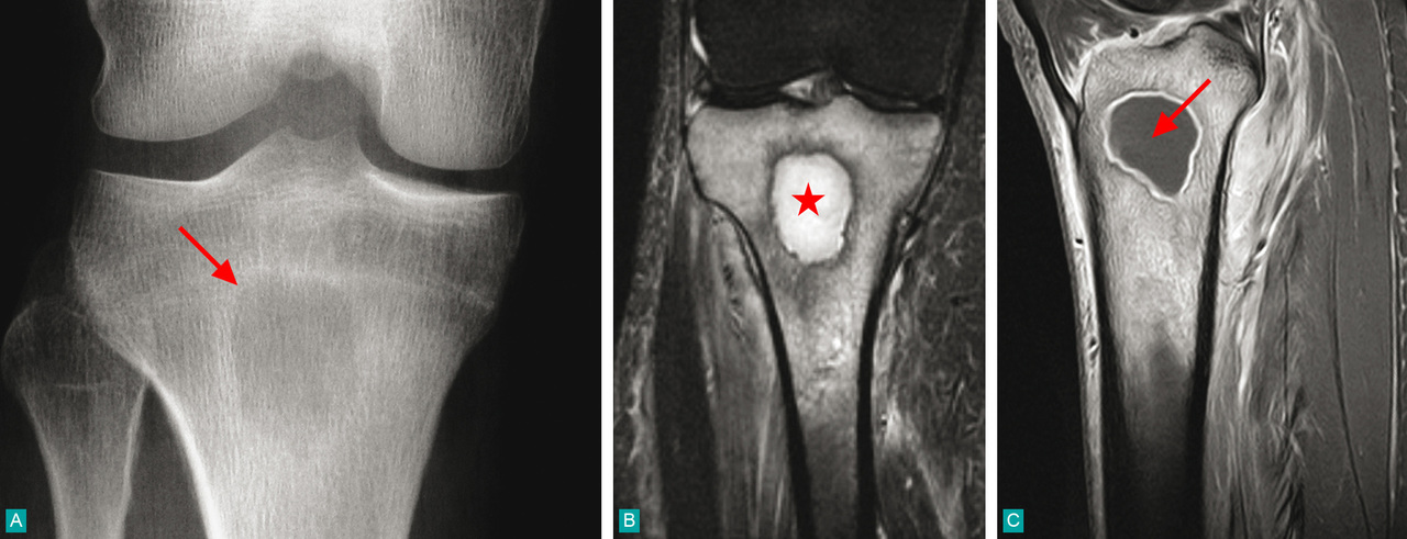 A. Radiographie standard de face : lacune métaphysaire bien limitée par un liseré de sclérose (flèche).B. Imagerie par résonance magnétique : coupe frontale en STIR, hypersignal intense de l'abcès centro-osseux (étoile).C. Après gadolinium, coupe sagittale en T1 avec suppression de graisse : rehaussement de la périphérie de l'abcès, le centre liquidien reste hypo-intense (flèche).