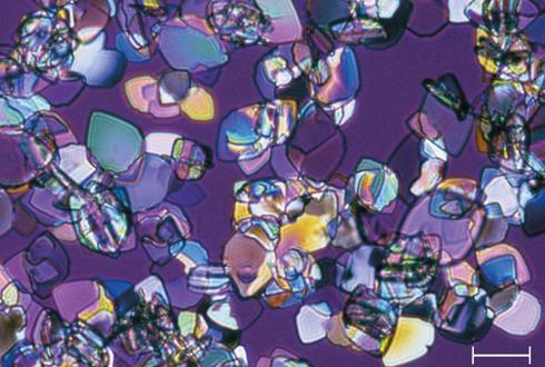 Les cristaux losangiques d'acide urique dihydraté sont fréquents chez les patients qui présentent une insulino-résistance.pH = 5,2. Barre = 20 µm.