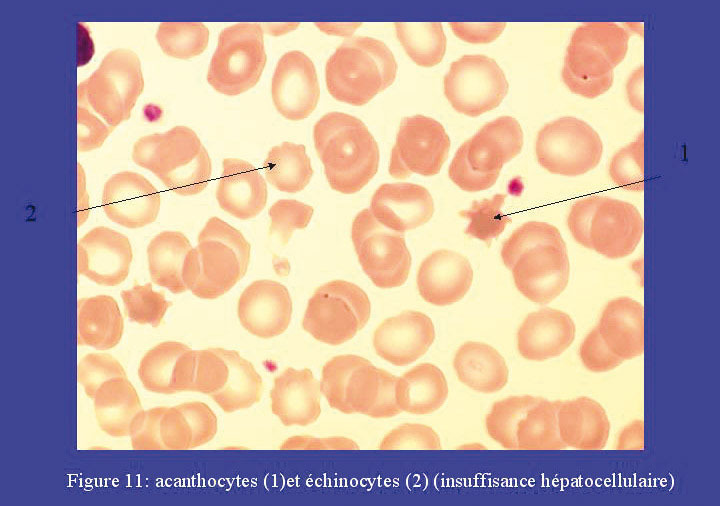 Les acanthocytes sont des globules rouges qui présentent cinq à dix spicules,irrégulièrement disposés et renflés à leur extrémité. Leur présence n’est pas artéfactuelle. Ils sont retrouvés dans de nombreuses circonstances pathologiques où prédominent les insuffisances hépatocellulaires sévères, les cirrhoses, surtout alcooliques. Plus rarement, leur présence révèle des maladies héréditaires : hypercholestérolémie familiale, a-bêta-lipoprotéinémie, phénotypes sanguins rares tels que le phénotype MacLeod, le phénotype Lutheran In. Ils peuvent se rencontrer après splénectomie.