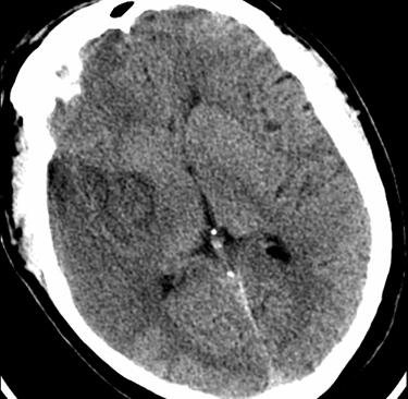 Hypodensité précoce traduisant un accident ischémique cérébral (AIC) sylvien droit superficiel.