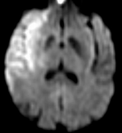 Confirmation de l'AIC sylain droit à H2. La séquence de diffusion en IRM permet la détection des mouvements des molécules d’eau intra à extracellulaire. Elle permet le diagnostic précoce des AVC ischémiques car il existe un « piégeage » de l’eau, lié à l’œdème cytotoxique (diminution du coefficient de diffusion) : se traduisant par un hypersignal (ici AIC sylvien droit à H2).