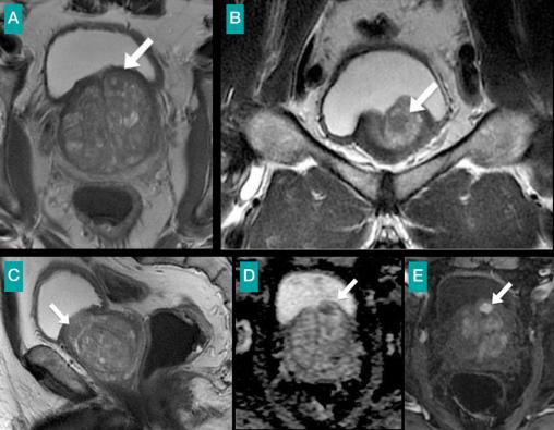 Patient de 63 ans ayant une élévation du PSA à 16 ng/mL.Le toucher rectal ne trouve qu'une grosse prostate souple. Deux séries de biopsies prostatiques sont négatives. Imagerie par résonance magnétique de détection pour ciblage de nouvelles biopsies. Les séquences pondérées en T2 en axial (A), coronal (B) et sagittal (C) mettent en évidence une hypertrophie prostatique et petite lésion en hyposignal au niveau de la prostate antéro-supérieure. (D) La cartographie ADC montre une restriction de la diffusion. (E) La séquence dynamique avec injection (30 s) montre un rehaussement intense et précoce de la lésion. La biopsie ciblée trouve un adénocarcinome de prostate de score de Gleason 7.