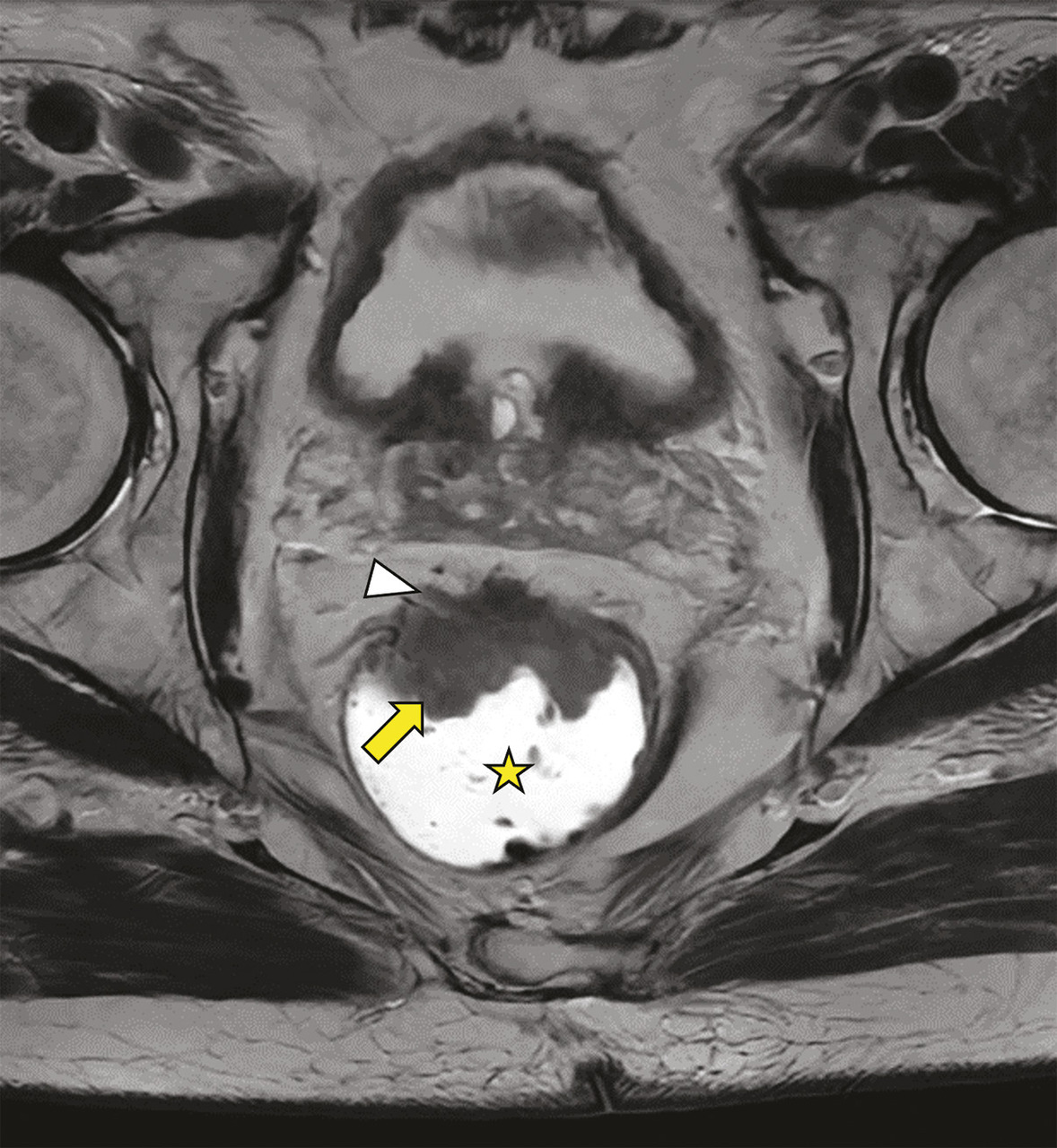Adénocarcinome du moyen rectum chez un patient de 77 ans. Image axiale en pondération T2 d’une IRM rectale montrant une lésion tissulaire antérieure du moyen rectum (flèche) avec envahissement du mésorectum (T3) et spicules (tête de flèche) en regard des vésicules séminales.