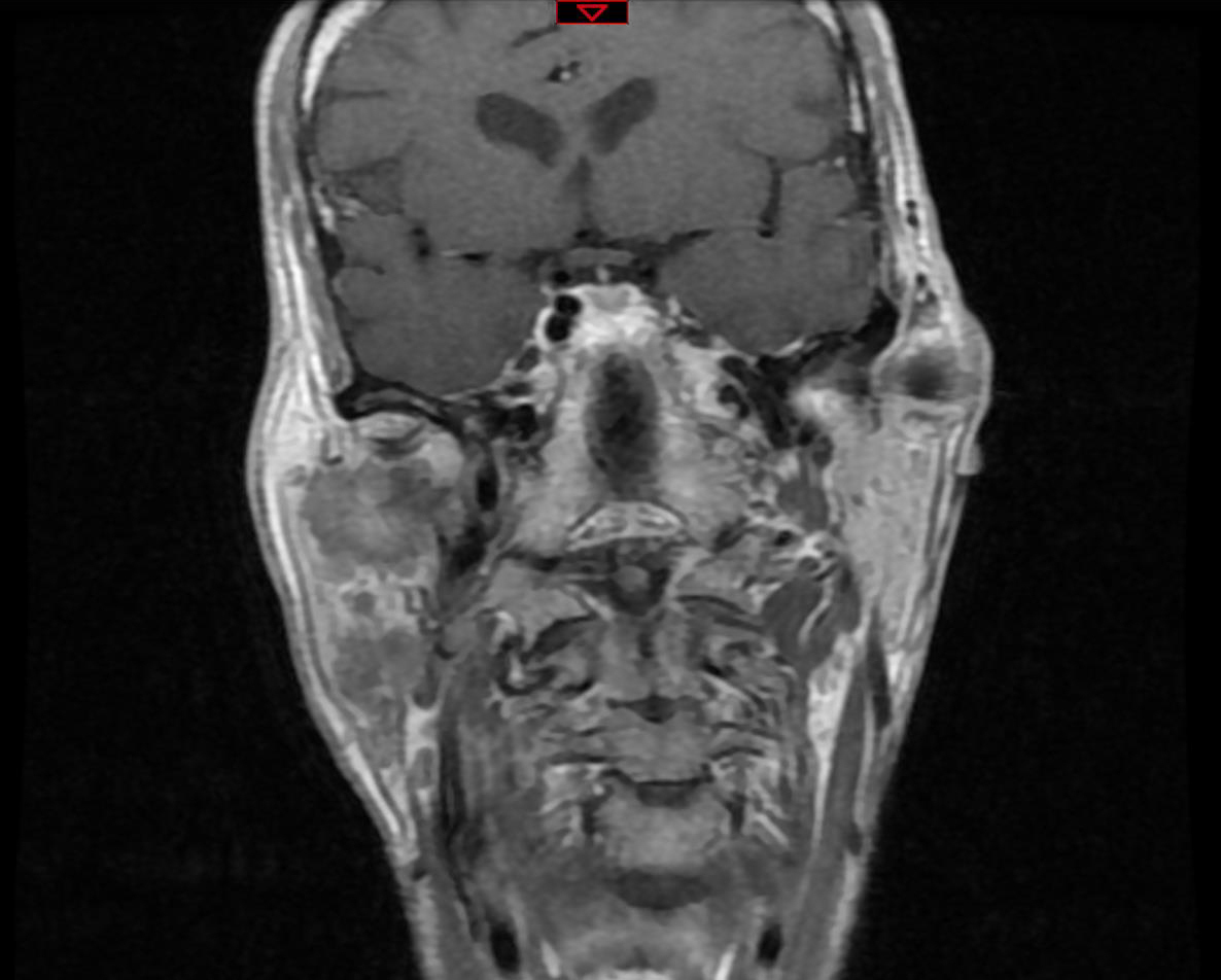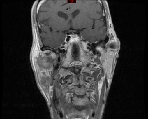 Dr Lanciaux-Lemoine, chirurgie maxillo-faciale, CHU Pitié-Salpêtrière, La Revue du Praticien IRM, coupe transversale, séquence T1, lésion mal limitée parotidienne droite, iso-signal T1.