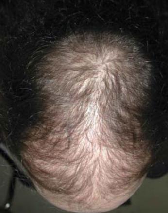 ©Vincent Descamps - La Revue du Praticien L’alopécie androgénique de la femme évolue lentement par rapport à celle de l’homme, et elle respecte généralement la lisière frontale du cuir chevelu avec une raréfaction ovale du vertex.