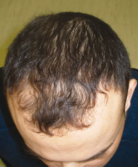 ©Vincent Descamps - La Revue du Praticien Chez l’homme, l’alopécie androgénique est circonscrite et à extension progressive, affectant successivement les zones fronto-temporales (golfes temporaux), le vertex, puis en tonsure. Elle a souvent un caractère héréditaire.
