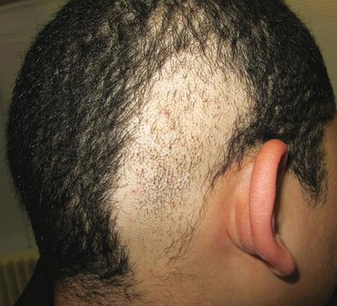 ©Pierre Assouly - La Revue du Praticien Les plaques causées par la trichotillomanie (arrachage de cheveux ou poils) sont irrégulières et les cheveux cassés sont adhérents lors d’un test avec une pince.