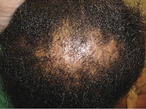 Alopécie du vertex avec aspect brillant du cuir chevelu. L’atteinte est moins sévère que dans le lichen plan pilaire (LPP).