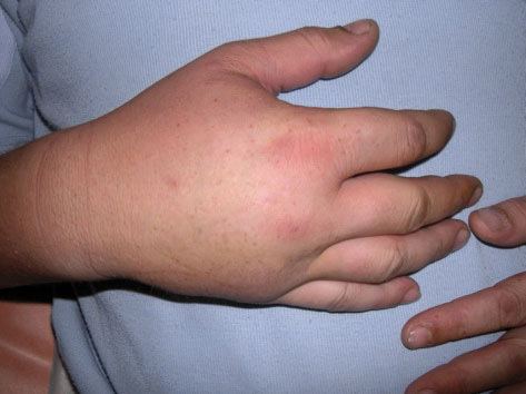 Œdème de la main droite et œdème sous-cutané blanc, mou, non prurigineux, survenant par crises et durant 2 à 5 jours.