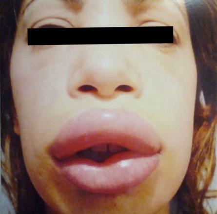 Œdème des lèvres localisé et transitoire. Angioedeme héréditaire. Œdème sous-cutané blanc, mou, non prurigineux, survenant par crises et durant 2 à 5 jours.