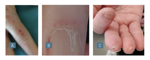 A : télangiectasies.B : mégacapillaires visibles à l’œil nu.C : calcinose responsable d’ulcérations.