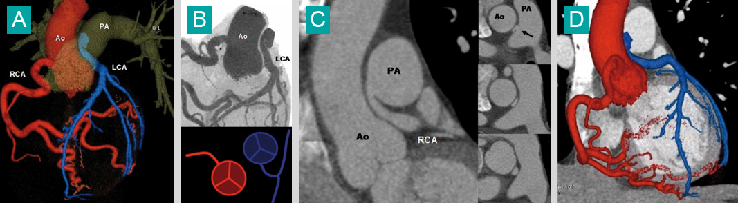 A. Volume rendering (VR) : l'artère coronaire gauche (LCA) en bleu naît de l'artère pulmonaire (PA), artère coronaire droite normale (rouge). Ao : aorte.B. Représentation de l'anomalie de naissance de l'artère coronaire gauche (LCA) en Maximum Intensity projection (MIP).C. Reformatage 2D dans le plan coronal et axial : trajet interartériel (entre l'aorte et l'artère pulmonaire) de l'artère coronaire gauche, qui est comprimée.D. Fusion VR et reformatage 2D des artères coronaires et des cavités cardiaques.