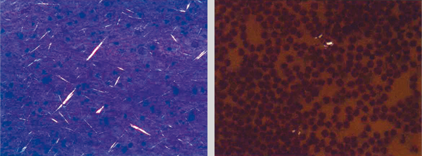 Aspect microscopique de cristaux d'urate de sodium (à gauche) et pyrophosphate de calcium (à droite). Coloration MGG ; grossissement x 400. Le diagnostic étiologique d’une arthrite microcristalline est apporté par la mise en évidence de cristaux d’urate monosodique en cas de goutte, de pyrophosphate de calcium en cas de chondrocalcinose articulaire. Tiré de : Guggenbuhl P, Coiffier G, Albert JD, Chalès G. Dossier. Arthropathies microcristallines. Rev Prat 2015;65(5):665-82. Courtoisie du Dr N. Stock, service d'anatomie et cytologie pathologiques (pôle cellules et tissus, CHU Pontchaillou, Rennes).